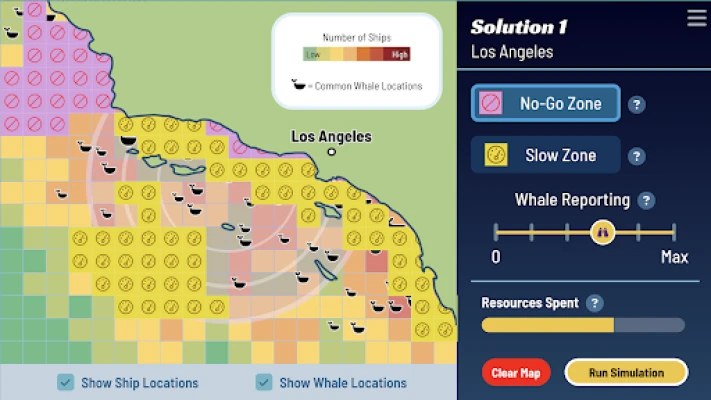 The Whale Protection Corps needs your help! Every year, ships carry goods to and from the coast of California. But, the west coast is also home to several migrating humpback whales that could get hit by the ships! In this simulation, use no-go zones, slow zones, and whale reporting to find a balanced solution to protect the whales!