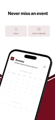 NEVER MISS AN EVENT The event section shows a list of events throughout the district. Users can add an event to their calendar to share the event with friends and family with one tap.