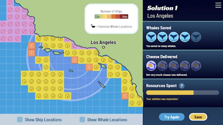 Whale Protection Corps is a life science game where players can simulate different solutions to the real-world problem of whale collisions. Each solution you try will be ranked on how well it protects the whales, how much it impacted shipping, and how many resources were spent.